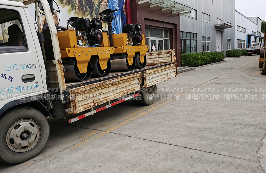 福瑞得4臺手扶雙鋼輪壓路機(jī)打包裝車發(fā)往泰安