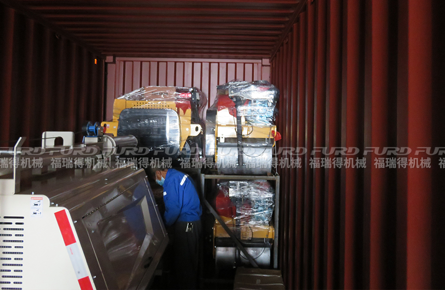 福瑞得機械壓路機和移動燈車打包裝車出口非洲