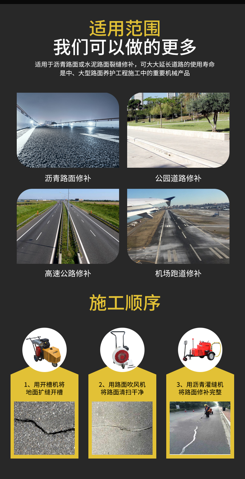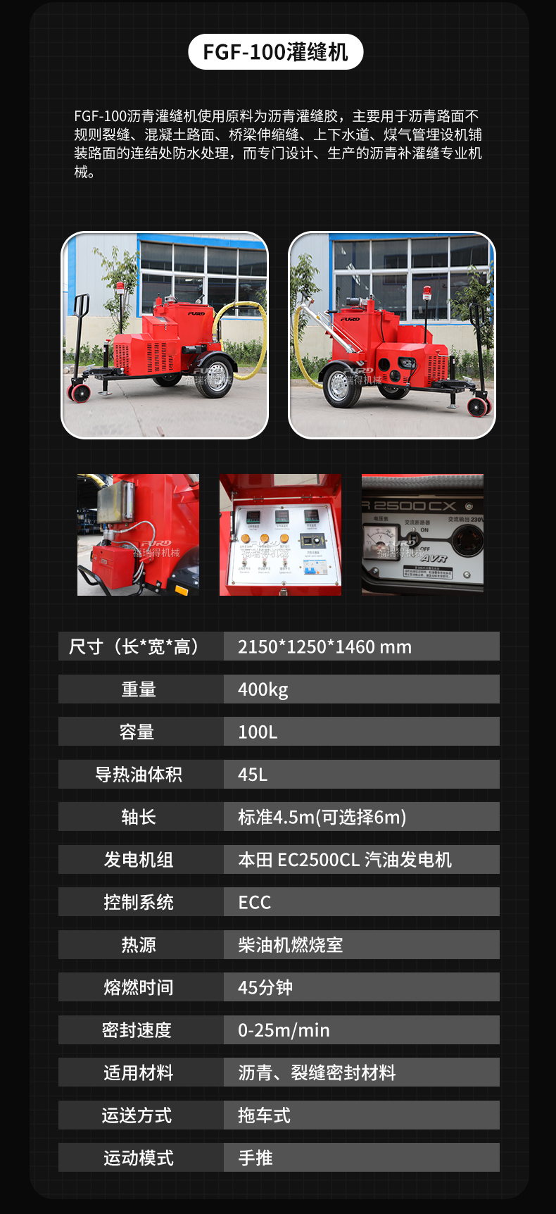 FGF-100瀝青灌縫機使用原料為瀝青灌縫膠,主要用于瀝青路面不規(guī)則裂縫、混凝土路面、橋梁伸縮縫、上下水道、煤氣管埋設機鋪裝路面的連結處防水處理,而專門設計、生產(chǎn)的瀝青補灌縫專業(yè)機械。