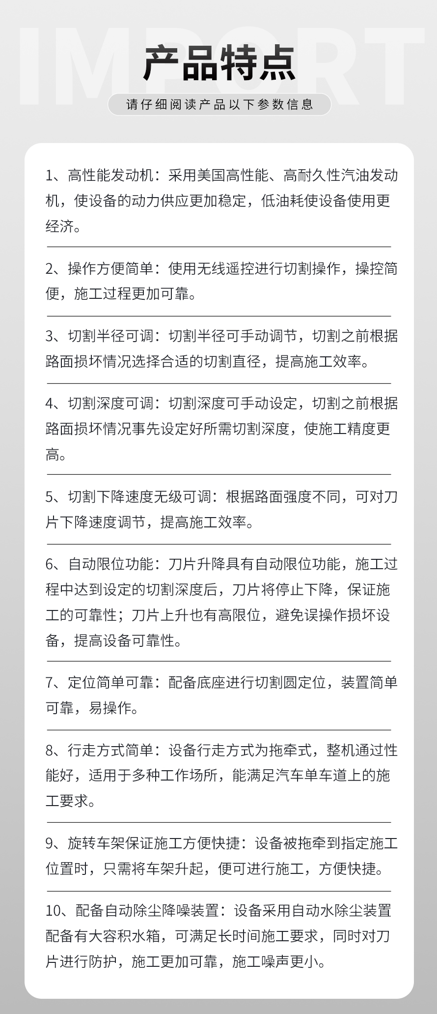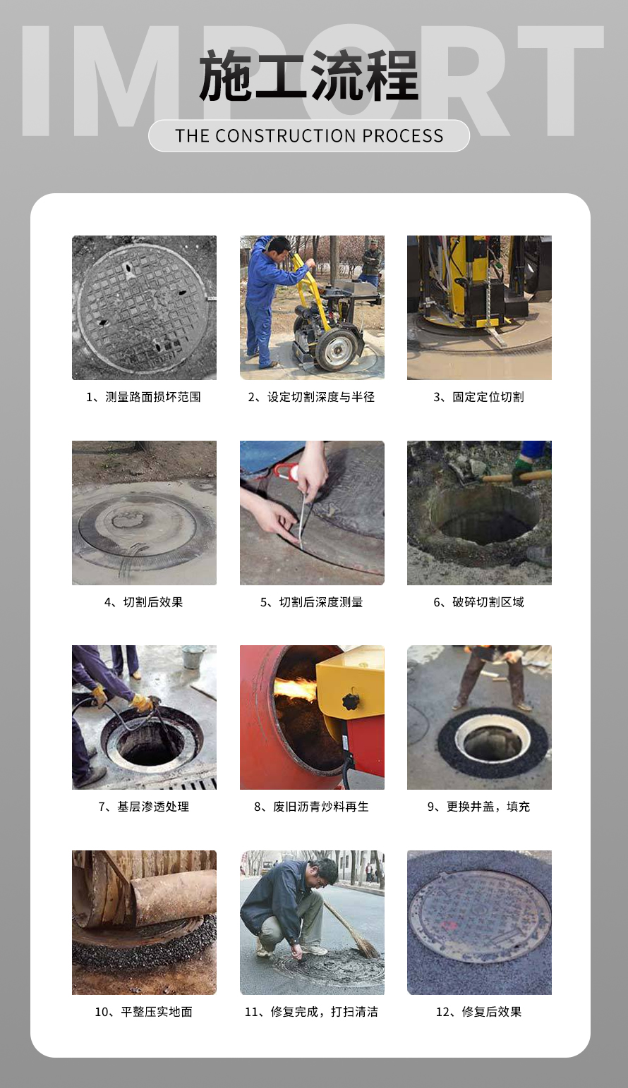 專門用于對(duì)城市道路中機(jī)動(dòng)車道等井蓋周圍的水泥混凝土或?yàn)r青路面進(jìn)行圓形切割。為清楚井蓋周圍的破損路面提供分割區(qū)域,修復(fù)后的地面美觀,延長(zhǎng)了路面的使用壽命。